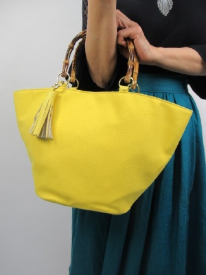 バケツ型 中央にマグネットボタン タッセル付き 内側ポケット有り バンブーの持ち手 タッセル付き