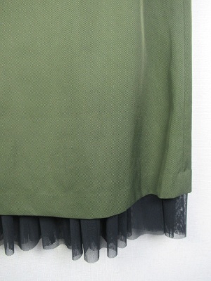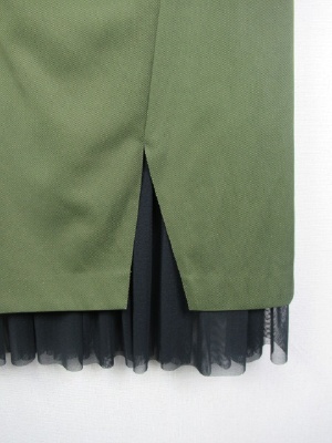 横ファスナー、前にスリットあり(やや右側)、スリット部分から黒のチュール素材が見えるデザイン(裏地の途中からチュールに切り替えされている、取り外し不可)