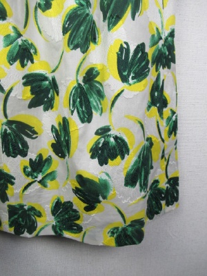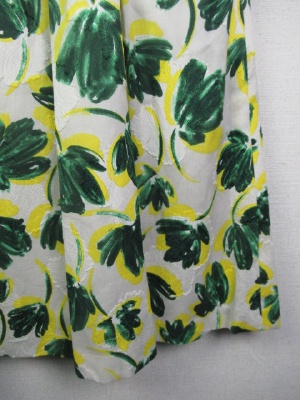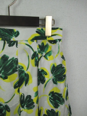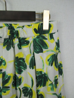 ベースは白〜ライトグレーのようなお色でイエローの花柄、裏付き、横ファスナー、ウェスト後ろゴム、前にタック、横脇ポケット