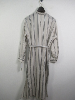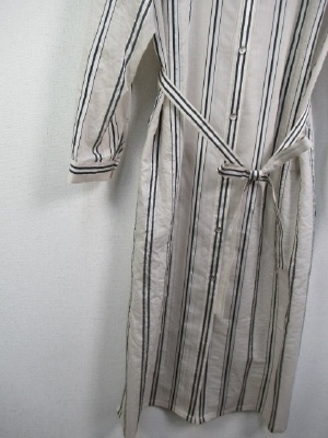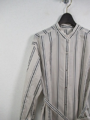 スタンドカラー、シルク混のストライプシャツ、共布のベルト付き、軽やかなロングシャツ