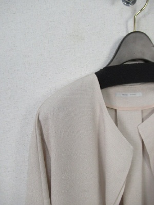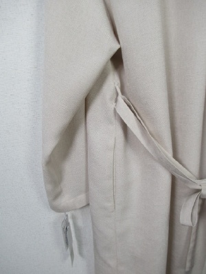 着流しタイプの薄手コート ややドロップショルダーで襟なし 前立ては素材違いもポリエステルサテン生地を重ねて2枚合わせにしてます ボタンなし 後ろはタック入り 共生地のベルト 脇にポケット 似通った色ですがベージュが濃い方です