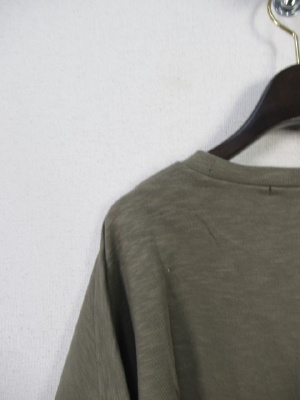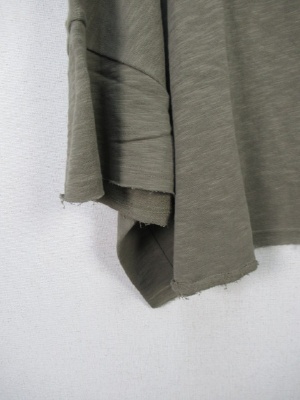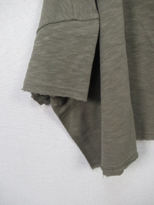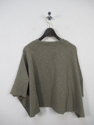 ビッグシルエットの短丈カットソー、袖口と裾は切りっぱなしのようなデザイン(端ミシンかけてあります)
