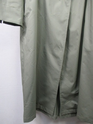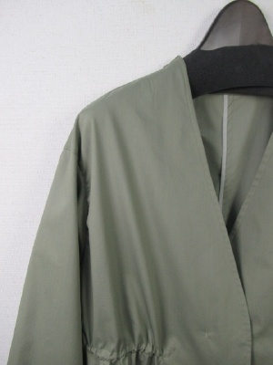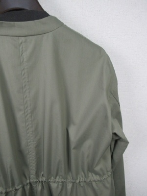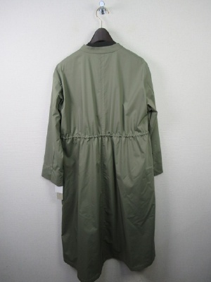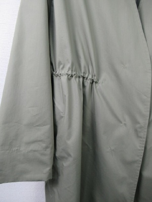 ノーカラーのスプリングコート、前ボタン2つ、ウェスト部分ゴムでギャザー(調節可能)やや前上がり、両横脇ポケット、袖口スリットで折り返し可能