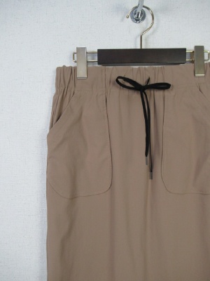裏なしのドロストスカート、ウェストリボン黒、伸縮素材、ポケットあり、後ろベント、手洗い可能