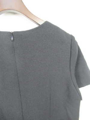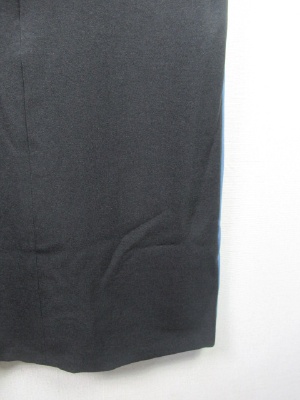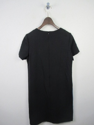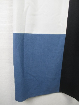 前身ごろは黒のベースに白とブルーのパッチワークデザイン、後ろ身ごろは黒、後ろファスナー、裏付き