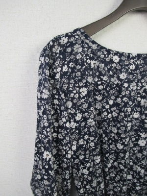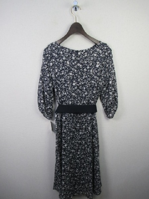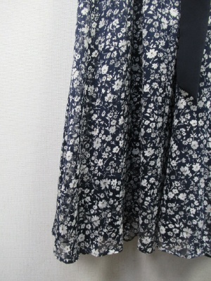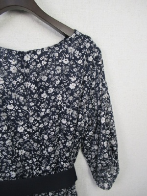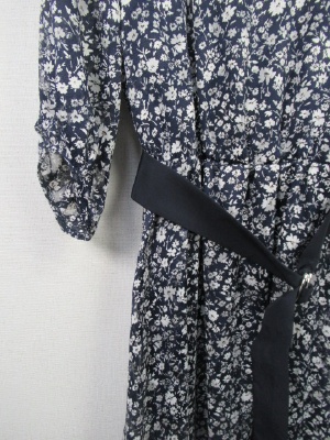 ネイビーベースに白の小花柄ワンピ、ウェスト部分ゴム入り、インナーキャミ(ネイビー色)付き、手洗い可能、サッシュベルト付き