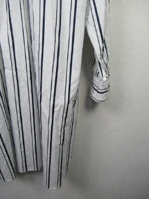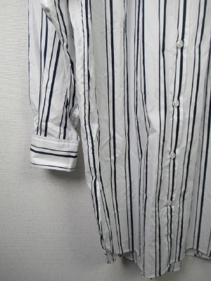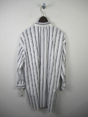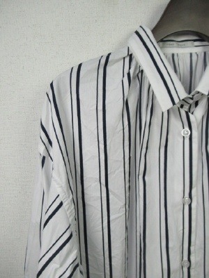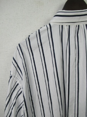 ID:98769と同じ、ストライプ柄、ビッグシルエットのやや着丈長めのシャツ、裾ラウンドで横脇スリット、襟の付けねはギャザー寄せ