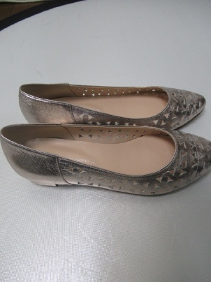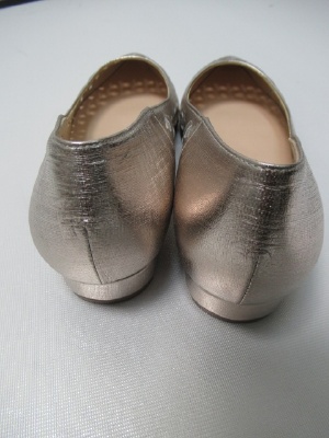 色はゴールドとしましたがシルバーゴールドという色が近いです。三角にカットワークされたパンチングの表面、ローパンプスやや小さめの作り
