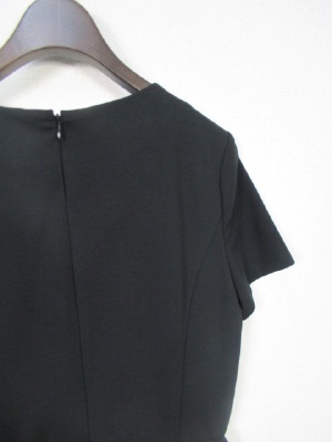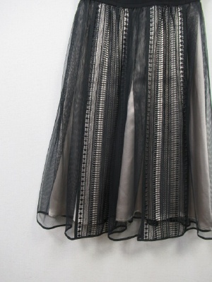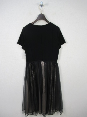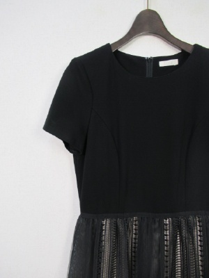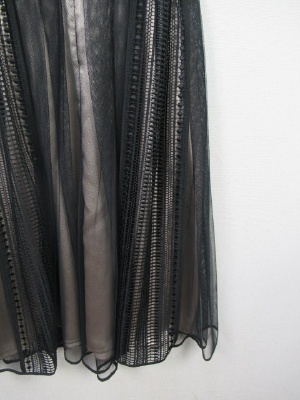 切り替えワンピース、トップは綿100でスカート部分はポリエステル100、スカート部分は2枚合わせになっていてチュールとカットワークレースのデザイン、後ろファスナー