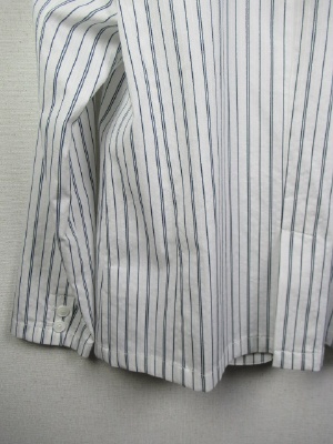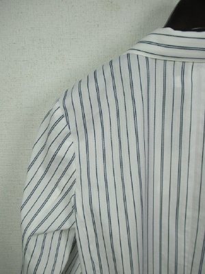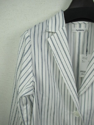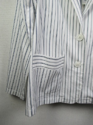 地模様のストライプのテーラードジャケット 裏地なし 張りポケット 後ろベントスリット入り 袖口2つボタンあり 手洗いOK