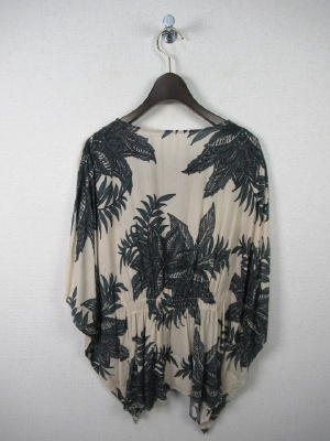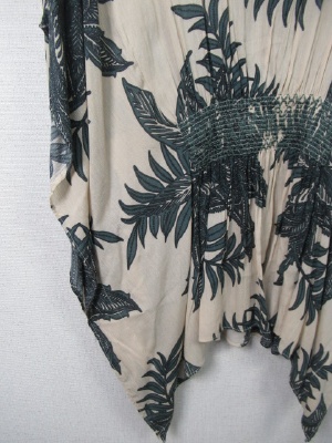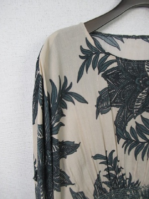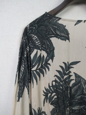 98908と同じ生地を使用したブラウス ボタニカル柄 フロントの方はシャーリングゴム(5cm程の中に幾本もシャーリングゴム 後ろは2本だけのシャーリングゴム 着用すると袖はひじくらいまで有ります