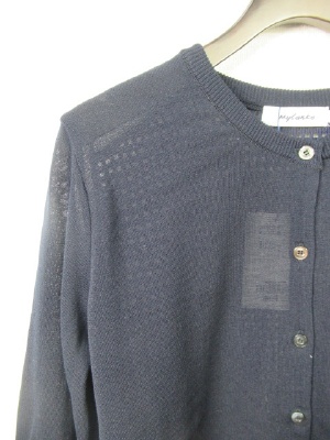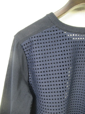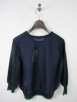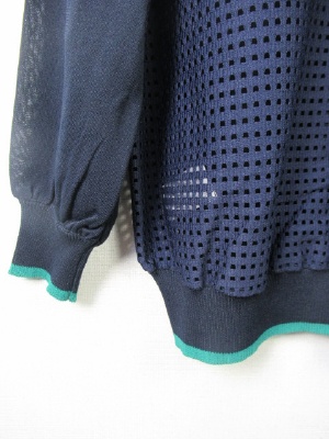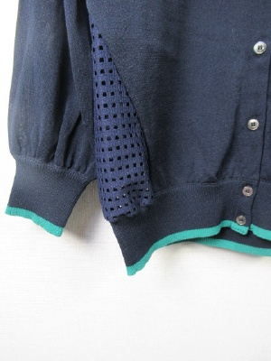 後ろ身ごろから裾あたりの前にかけて異素材のパンチング生地 クルーネックのカーデ 7分袖 袖口にライン入り 白はネイビー ネイビーはグリーン 手洗いOK