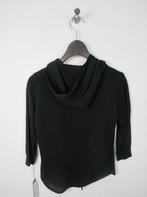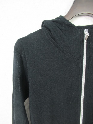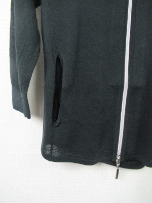 シルバーファスナー(ダブルジップ)の七分袖パーカ、手洗い可能、透け感のある生地、裾はラウンド、袖口リブ