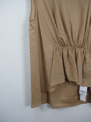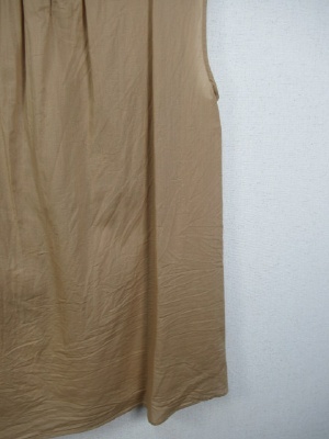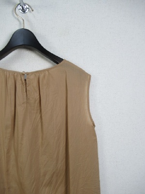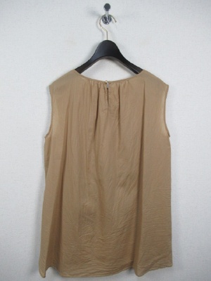 ノースリーブブラウス、前後差あり、前身ごろ中央部分にギャザー寄せデザイン、手洗い可能、裏地なし、後ろボタン(ゴールド)