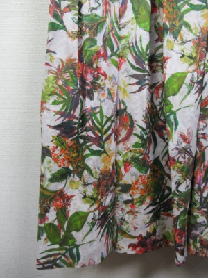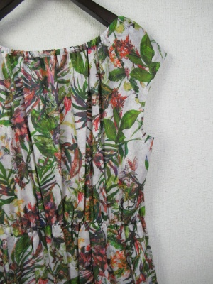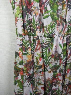 サーモンピンクのようなお色の花柄デザイン、ウェストゴムになっていて、左側御裾のみスリットあり、インナーキャミ付き、首周りもギャザーゴムになっている
