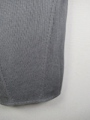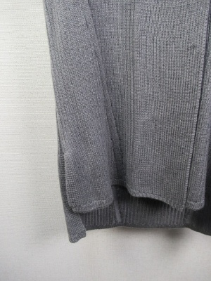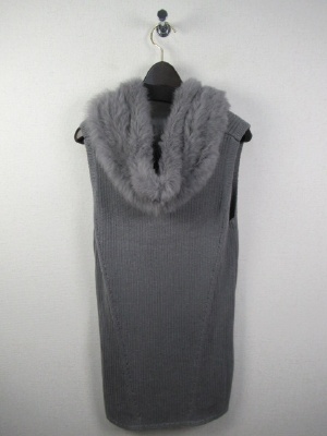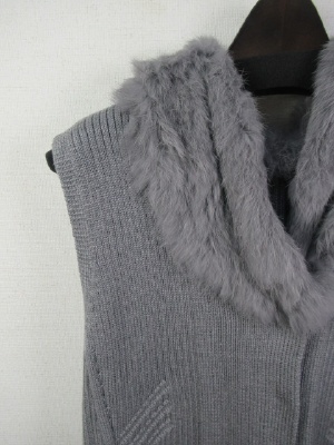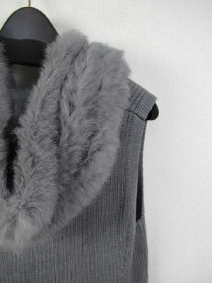 長め 脇裾はスリット入り(前上がり) リブ編みのニット フロントホック フードはラビットファー(取り外しできない)