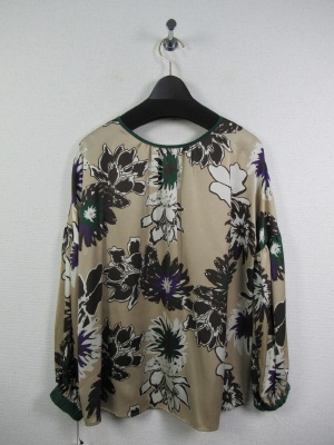 花柄ブラウス、首周りと袖口のトリミングはそれぞれ色が違う(ベージュ→グリーン・ネイビー→キャメル・ブラウン→ピンク)袖は途中切り替えでその下がボリューム袖になっている、手洗い可能