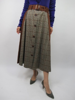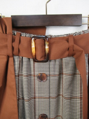 無地の生地(綿100%)とチェック柄の異素材使い 中央のボタンデザイン ウエスト共生地のベルト 右のベルトのところにポケットのようなデザインが有りますが取りはずしできます 裏地有り 手洗い可能
