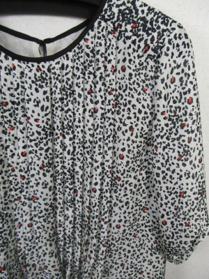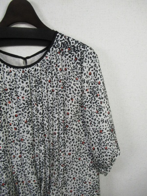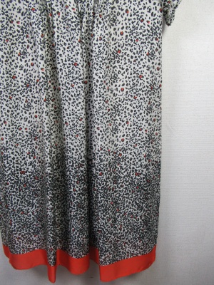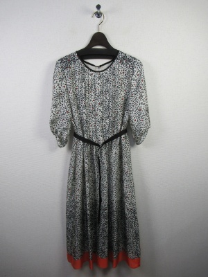 白地に黒とオレンジの細かいプリント柄 丸襟(黒のふちどり)袖は7分で口はゴム入り フロントはピンタックデザイン 後ろは背中に切り替えギャザー有り 裾は5cmほどオレンジ色 裏地はスリップ付きかぶりタイプ 付属に黒のベルト 脇にベルト通しは無いのでお好みで絞 めて下さい