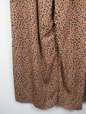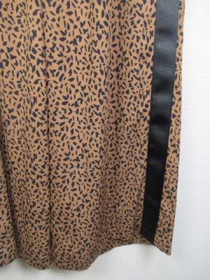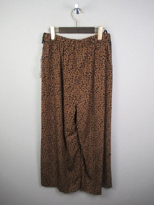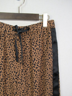 レオパードのようなプリント柄のワイドパンツ、両横にグログランテープのデザイン(テープは両方とも黒)、ウェストは総ゴムでドロストタイプ、裏付き