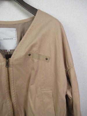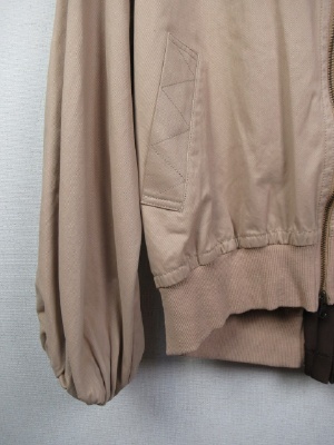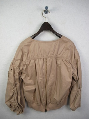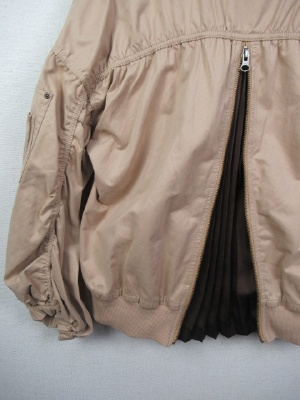 Vネックのブルゾン 後ろに別布のプリーツ生地をはさむ 裏地なし