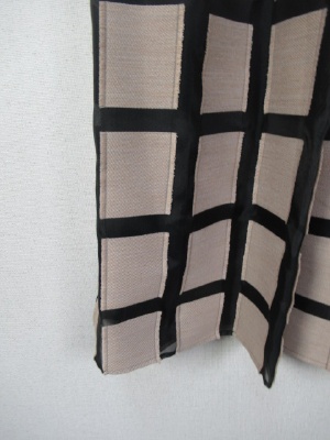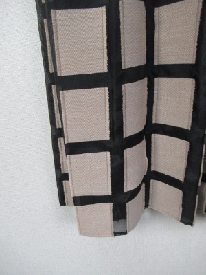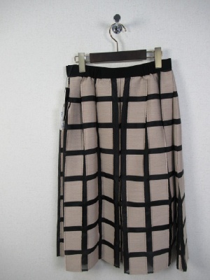 パッチワークに様な格子になった生地 黒のところはサテン地にようでやや透け感 茶系の生地は周りがフリンジ仕上げに インベルは黒 横ファスナー 裏地あり ブラウスとセットになる