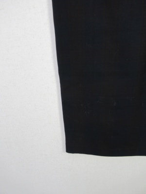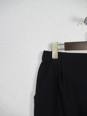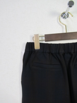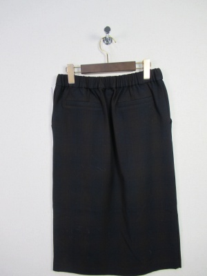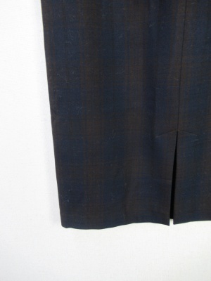ネイビーのベースに茶色のチェック柄、ウェスト(後ろ)ゴム、脇ポケット、前スリット、裏地無し、裏側は起毛