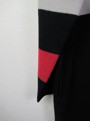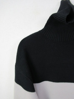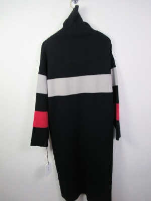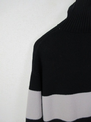 ライトグレーとピンクの太ボーダー柄のワンピース、ニット、タートル