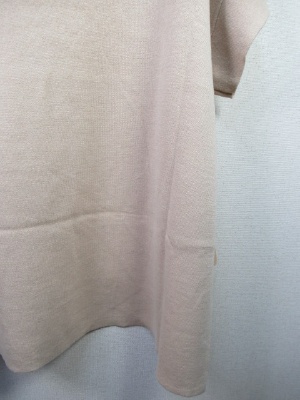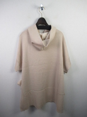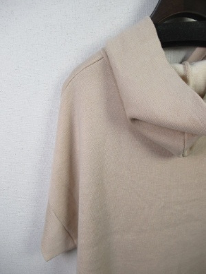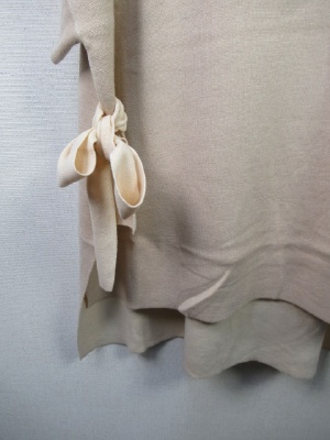 ポンチョ フード襟 袖筒は有り その下の脇は開いてる ニットの裏表で色違い(表はベージュ 裏はオフホワイト)脇のリボンは裏の色と同じ やや前上がり