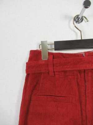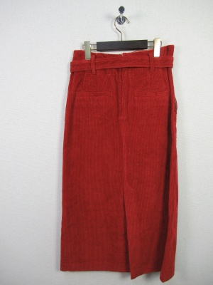 コーデュロイのスカート、ハイウェスト、共のベルト付き、後ろスリット、後ろファスナー、裏地なし、ロングスカート、張りポケット