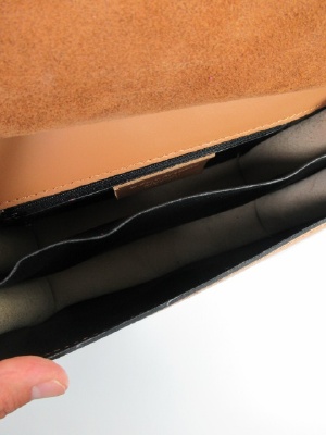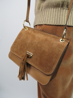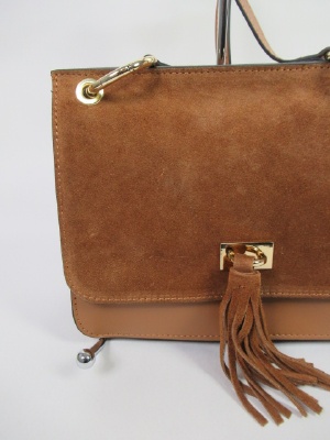 牛革のバック、ショルダーベルトは取り外し可能 かぶせのところはスエード 他はスムース皮 留め金はタッセル 中央に仕切りがある