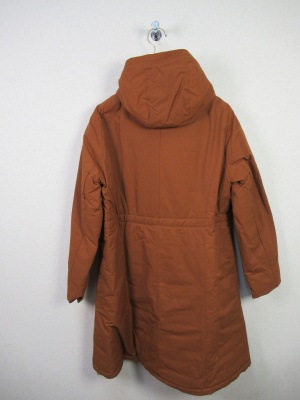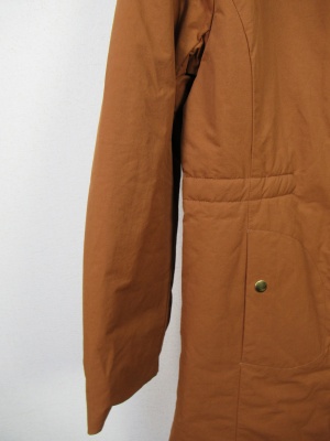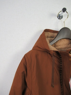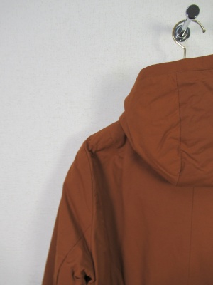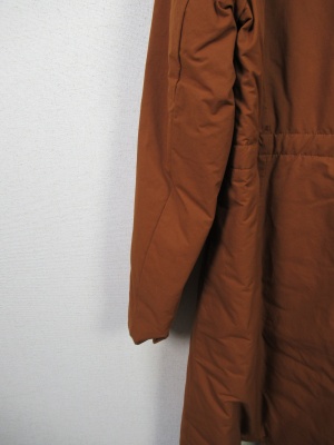 中にキルティングで縫い目があり、表地はキルティング模様が入らない、ウェストの内側に紐調整で絞ることができます、フード襟、フードの内側も絞ることができる