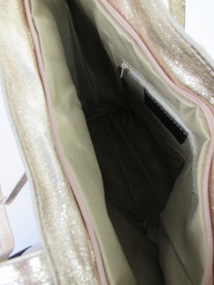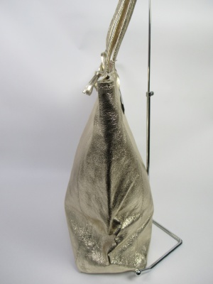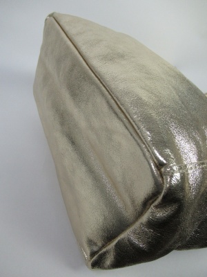 牛革に金の箔でコーティング 天ファスナーその上に共に皮紐でリボン結び 内側ポケット有り 持ち手が長く肩にもかけれる