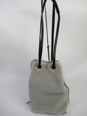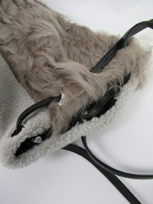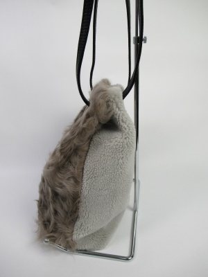 巾着型 毛皮(カルガンラム)の癖毛がポイント 後ろはポリエステルのボア 持ち手は牛革をを使用 マグネットボタン 内側にポケット有り