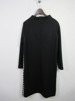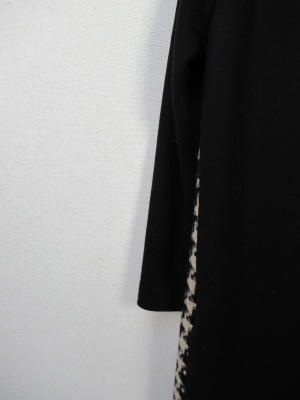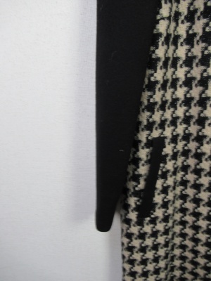 前身ごろは異素材で千鳥格子柄(後ろは共に黒の無地)、後ろファスナー、脇ポケット、オフタートル気味の立ち襟、裏付き