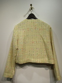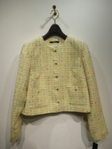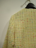 ※春物新作 春らしいイエローを基本ベースにしたミックスツイード ところどころカラフルな糸をポイントにしてます デザインはベーシックなノーカラーのジャケット 飾りボタンもイエローベース 総裏付き