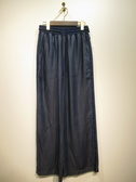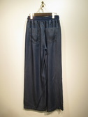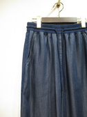 ダンガリー素材のワイドパンツ、ウェスト異素材でギャザーゴム+紐調整可能、両脇にグログランテープ、ブルーがライトグレー・ネイビーはネイビーのテープ、手洗い可能