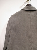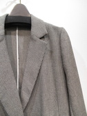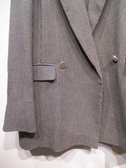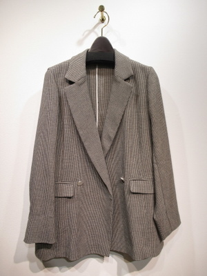 細かいチェック柄の生地、裏地なしのダブルジャケット、テーラード襟、後ろスリット(中心)、袖口はスリット入りで折り返しできます