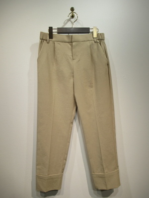 くるぶし丈 テーパードパンツ 裾はダブル フロントファスナー 裏地無し フロントタック入り 脇ポケット 生地は助防止と吸水速乾あり 手洗い可能