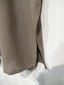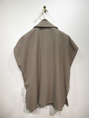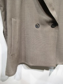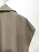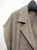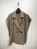 麻見えするポリエステル生地を使用、テーラード襟のジレ、裏地無し、脇スリット入り、フロントダブルボタン、ポケットあり、通気性・吸水速乾性に特化した生地を使用、手洗い可能