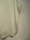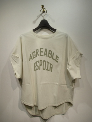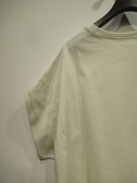 オフホワイトベースに優しいカーキのロゴ入りカットソー、身幅広め、前後差り、裾ラウンド、お袖はタックで立体感を出したデザイン、手洗い可能