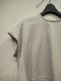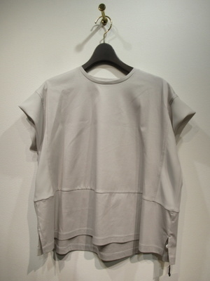 フレンチスリーブのカットソー、袖から脇にかけて異素材使用(同色ポリエステル)、裾のあたりに切り替えあり、脇スリット入り、手洗い可能