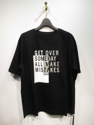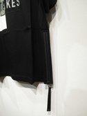 ビッグシルエットのドロップショルダーTシャツ、左脇だけに黒のファスナー、フロント部分はイラストロゴとドット柄のチュールレースを貼り付けたデザイン、手洗い可能