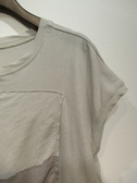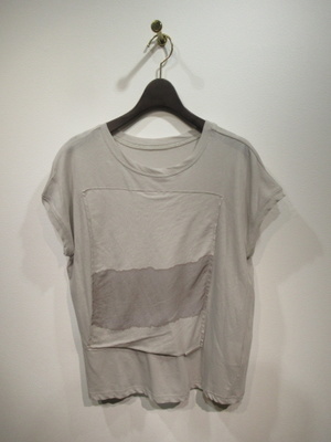 フレンチスリーブのスクエアカットソー、フロントに同生地で染め模様のデザインが重なってます、左下にシルバーのワンポイントあり、手洗い可能